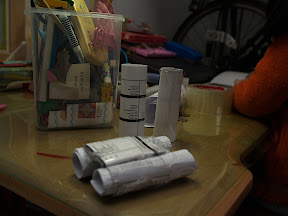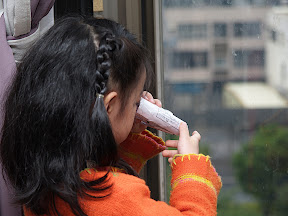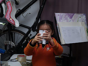今天早上起床後,還在玩,後來小予為了搶姊姊手上的望遠鏡還在鬧脾氣,不過樂樂很慷慨的就讓給他了。過了不一會兒,樂樂又出現在她的書桌前,開始拿著剪刀、膠帶動起手來,一下子做這,一下子做那,又拿來找我幫忙,我也不清楚她在忙什麼。慢慢的,有點形狀出現了,她在做一個雙筒的望遠鏡,記得她上一次看到雙筒的望遠鏡應該有一年半以上的時間了吧?那時小家的家人們一起到青草湖去賞鳥?