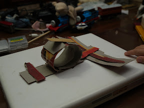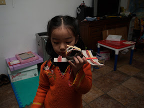 記得那時候,她一個人在她的書桌前默默的做,很專心的做,我們夫妻兩人都沒有注意到她在做什麼,直等到成品出現,我們下了一大跳,她把我們給她的一張包裝盒的紙剪掉,東黏西黏的就做出來了,也沒有看她參考哪張圖片,就這樣出現了,這時我們才特別注意到,她真的喜歡動手做。